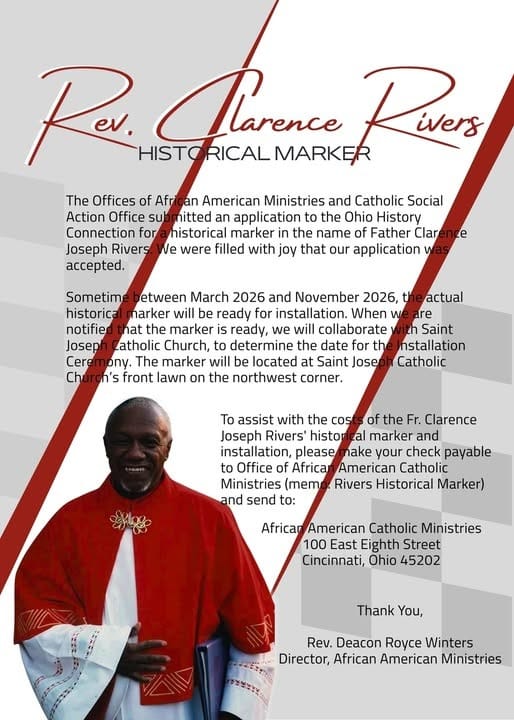 The latter event marked the 20th anniversary of Rivers’ unexpected death in Cincinnati at the age of 73 in 2004, and included a blessing of the grounds for the upcoming historical marker, which will be located at Rivers’ former parish, St. Joseph Catholic Church in Cincinnati’s West End. Dcn Winters noted that tax-deductible donations to assist with the marker’s construction and installation can be made to the Office African American Pastoral Ministries.