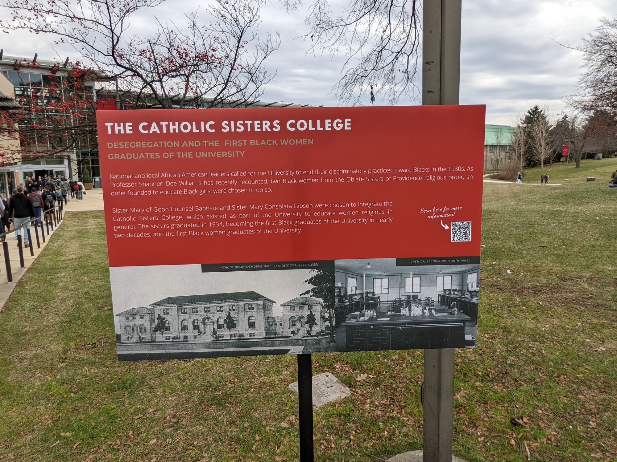 More specifically, the Catholic University of America has installed a sign in the middle of campus describing the period when the university refused to admit Black students and, decades later, when two Black nuns reintegrated the university in 1933.