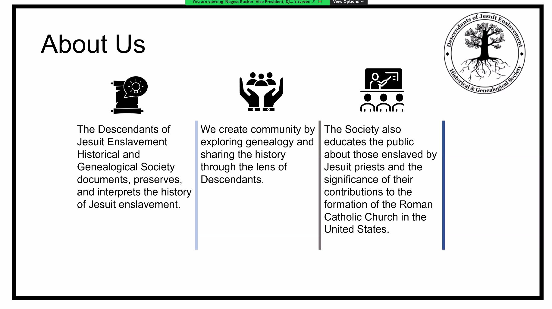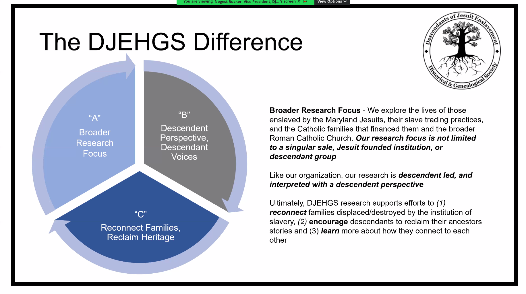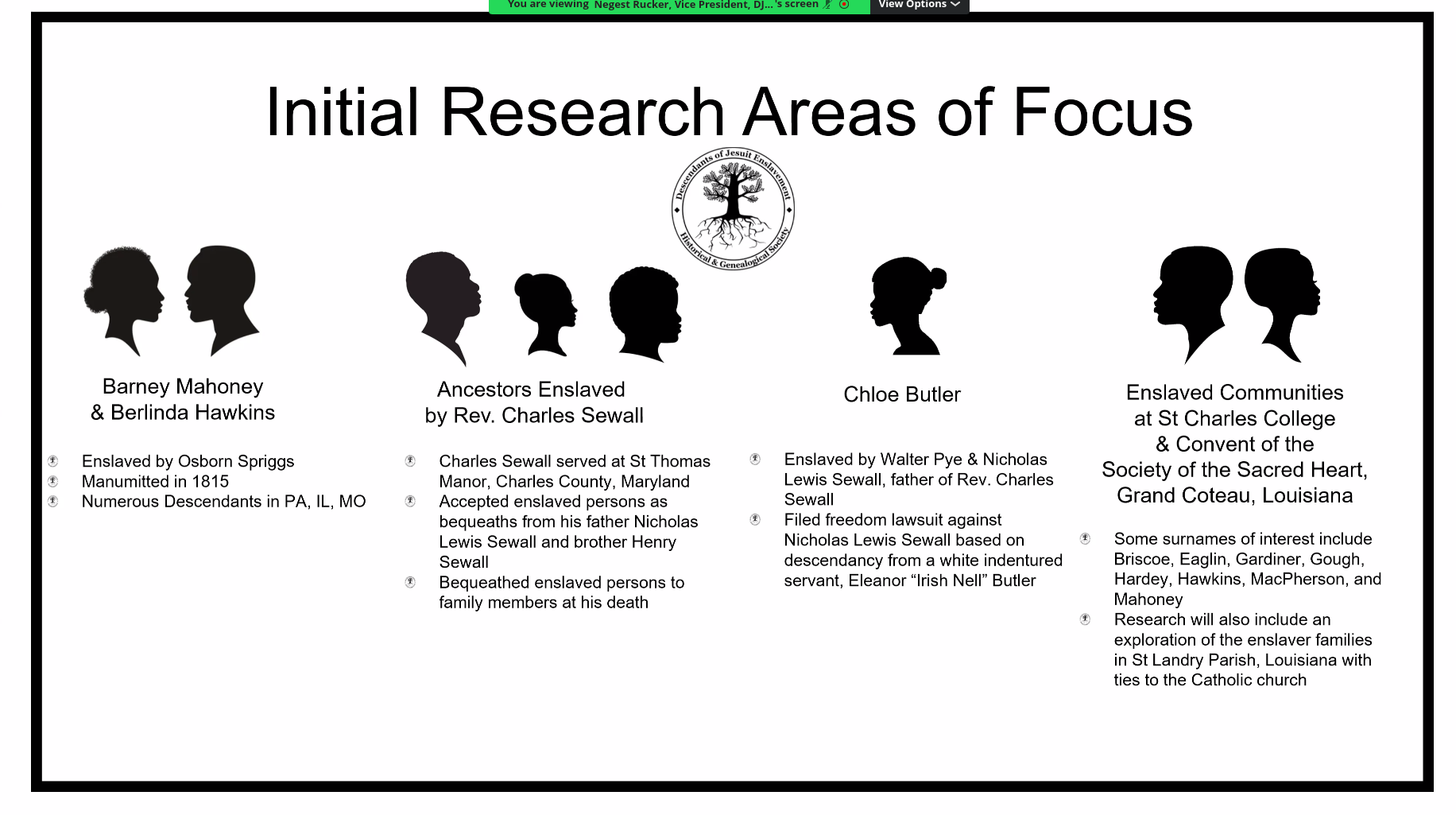 Descendants of Jesuit Enslavement Historical & Genealogical Society (DJEHGS) shared the news on April 18, during the latest in a series of ongoing virtual meetings for the previously unincorporated genealogical community that dates back to pandemic times.