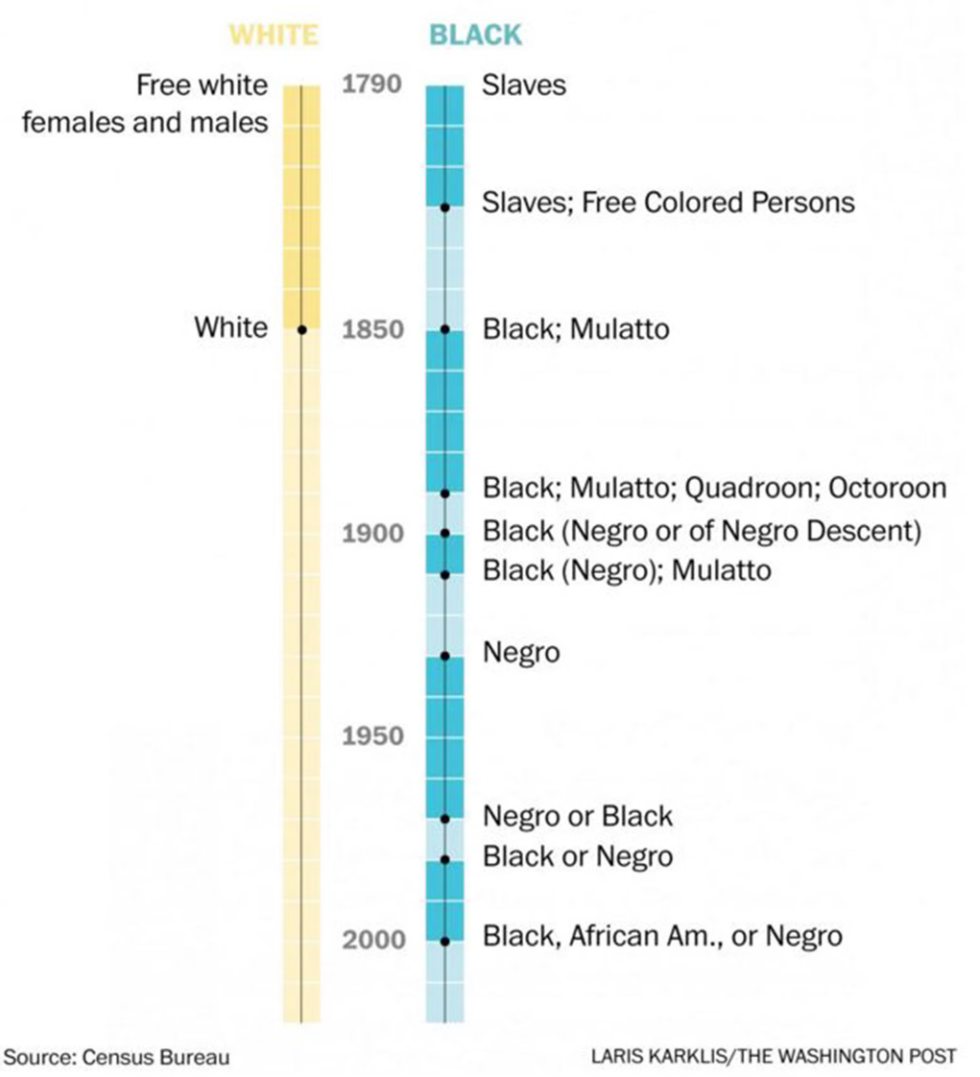 For human beings brought to the United States as slaves, and for their descendants, racial categorization has evolved over time. Through the 1810 census, this group was simply identified as slaves. By the 1820 census, officials had updated the racial category to include both slaves and Free Colored persons, in acknowledgment of the growth of the latte population. This nomenclature persisted until the 1850 census, when a measure of “black blood” was introduced—occasioning the terms Black and Mulatto. These persisted through the end of Reconstruction.