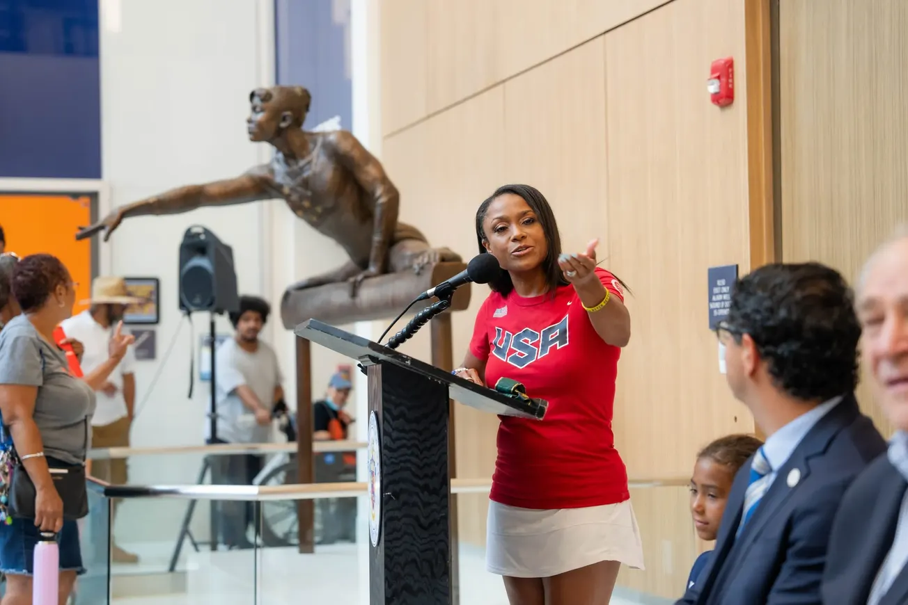 The history-making gymnast Dominique Dawes is now immortalized in her hometown, where a bronze statue was unveiled in her honor on July 23 at the Silver Spring Recreation and Aquatic Center (SSRAC) in Maryland. Dawes was present ahead of the 2024 Paris Olympics, where her legacy was on full display.