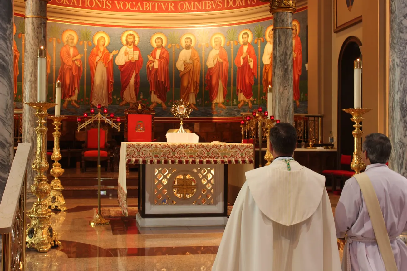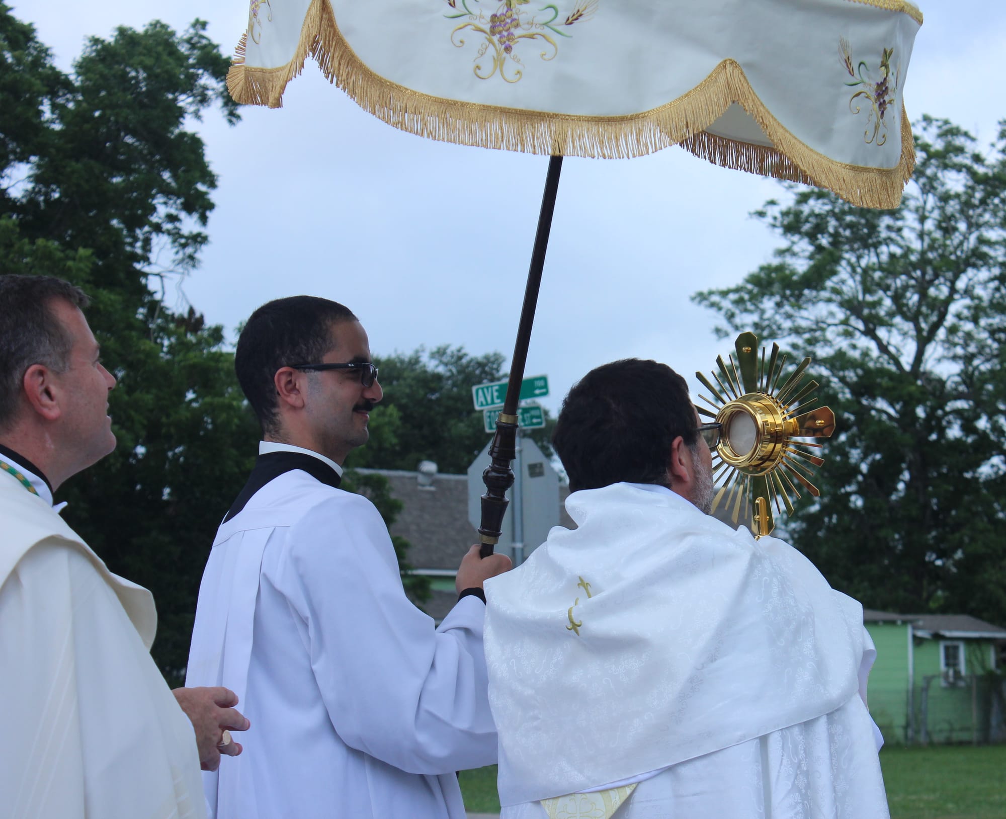 “At the seminary in Florida where a number of our men study, St. Vincent de Paul, etched in the marble wall above the tabernacle are the words of a sermon of St. Augustine on the Eucharist: Sacramentum pietatis. Signum unitatis. Vinculum caritatis. Oh, Sacrament of devotion. Oh, sign of unity. Oh, bond of charity,” Toups said.