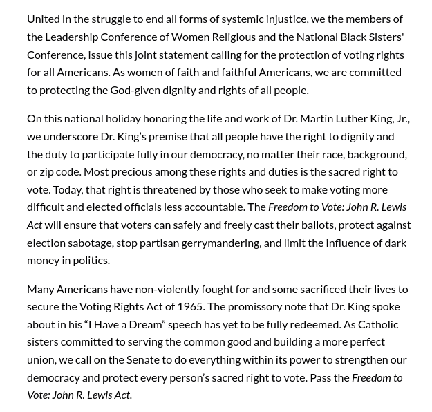 On this day honoring the life and work of Dr. King, LCWR and the National Black Sisters' Conference (NBSC) have issued a joint statement calling on the Senate to to pass the Freedom to Vote: John R. Lewis Act. The full statement can be found at https://t.co/az3YUillji