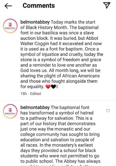 In February 2022, however, a social media post for Black History Month from Belmont Abbey College became an issue. The post featured a picture of the font and ignited a brief firestorm among students and alumni, proving that while the stone was carved into a new shape long ago, the wounds of its history remain raw and unresolved.