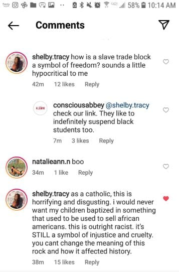 According to campus history, this stone served as a Native American altar and later as a slave auction block. However, some alumni have had questions about its true history and, at least, its context. Within hours of the BAC’s post in 2022, students demanded answers and a more comprehensive acknowledgment of Black history on campus. The college removed the post without providing any additional context.