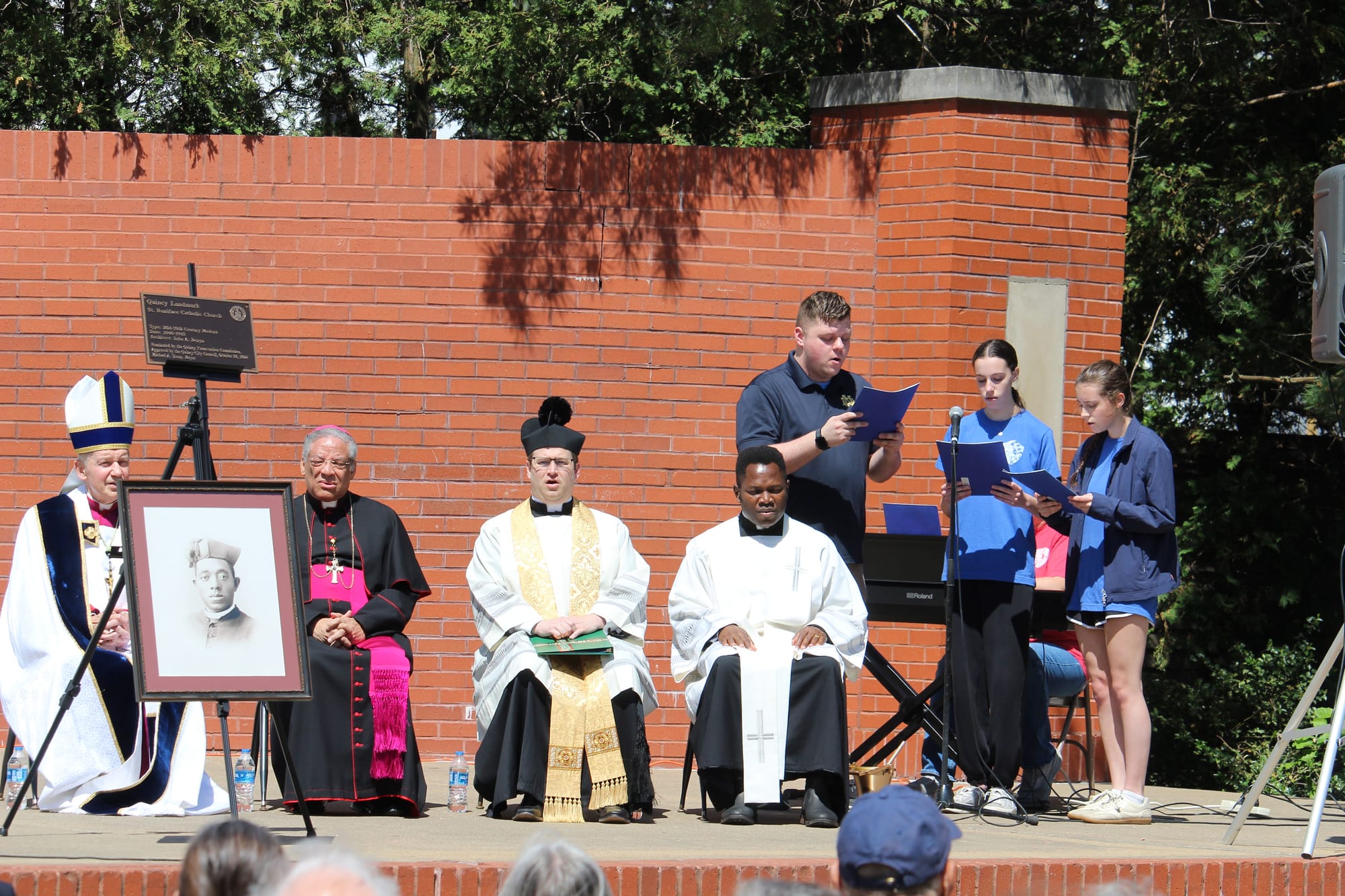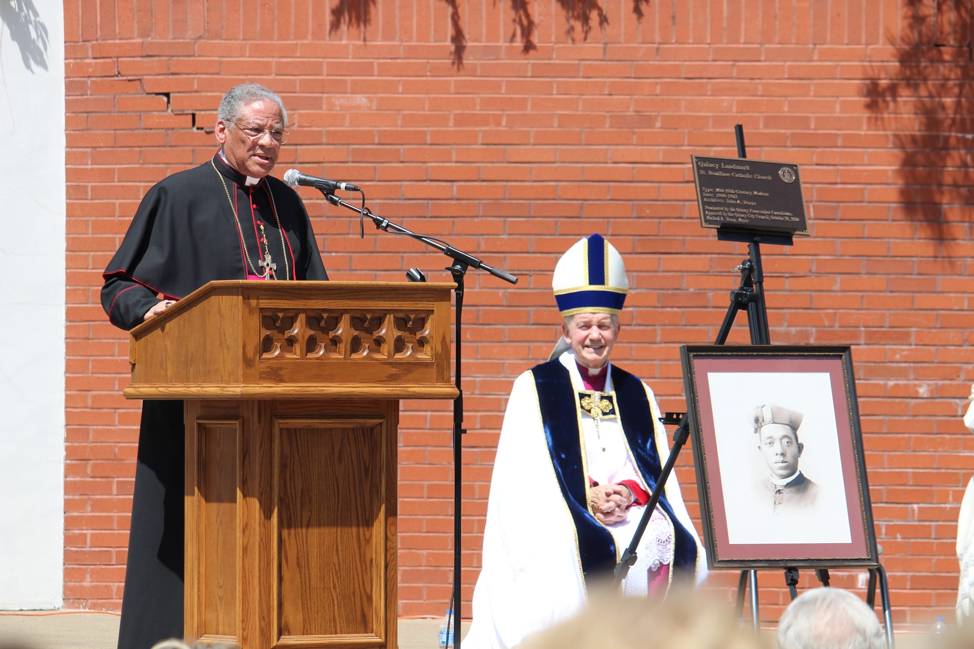 Bishop Thomas Paprocki of Springfield joined Auxiliary Bishop Emeritus Joseph N. Perry of Chicago; Dr. Linda Moore, the mayor of Quincy, Illinois; local Catholic and Protestant leaders; politicians; and students for a ceremony at the shrine site, the former St. Boniface Church.